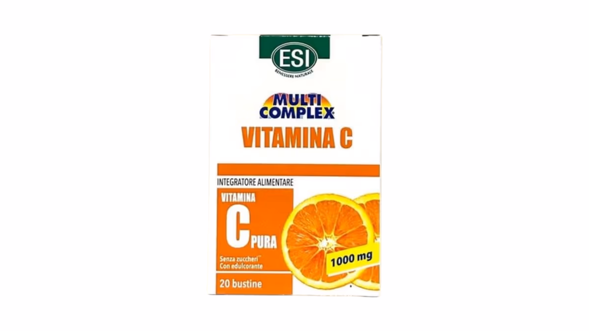 ESI Vitamina C 1000mg x20 bustine – Suplement me vitaminë C me dozë të lartë që ndihmon në forcimin e sistemit imunitar, redukton lodhjen dhe mbron qelizat nga stresi oksidativ. Me shije portokalli, pa sheqer dhe e përshtatshme për veganë.