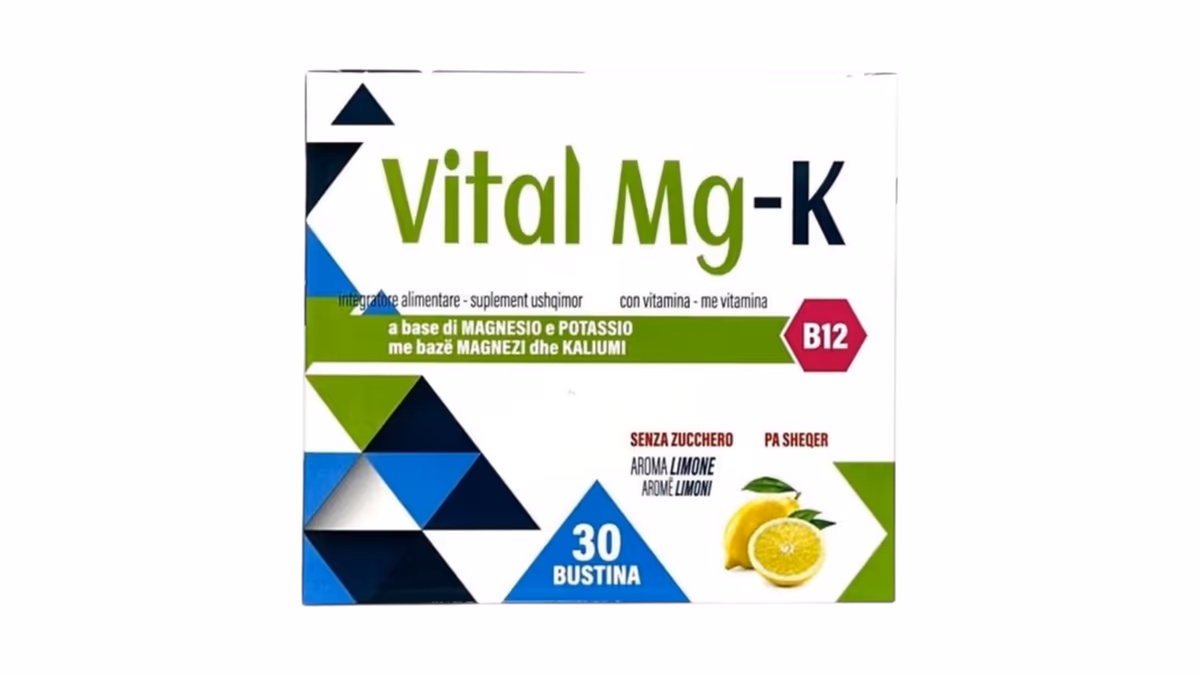 Vital Mg‑K x30 bustine është një integrator ushqimor që kombinon magnesium dhe potassium në formë bustinash që treten në ujë.